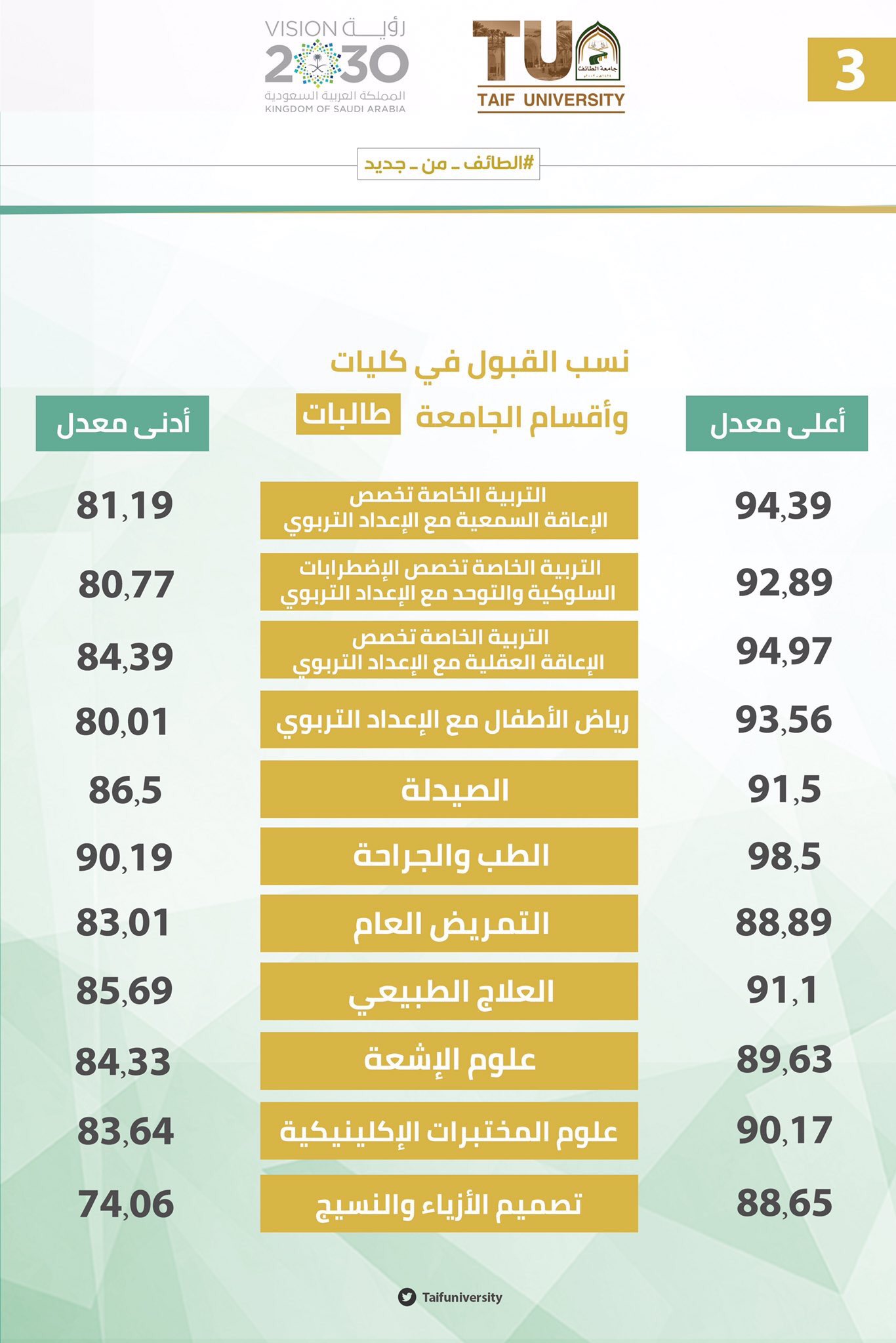 نسب القبول للعام ١٤٤١/١٤٤٠ هـ. نسب القبول في تخصص العلاج الطبيعي في جامعة الطائف إن جامعة الطائف من الجامعات الكبرى في المملكة والتي تقوم بدراسة برامج تعليمية عديدة ونسب القبول في تخصص العلاج الطبيعي في جامعة الطائف للطالبات والطلاب كالأتي : Jun 03, 2021 · جامعة الطائف; وظائف مدنية، عسكرية،السيرة الذاتية cv،النتائج،القطاع الخاص،القبول والتسجيل،التقني،التعليم، الترقيات، التقاعد،التأمينات ،الموارد البشرية ستعلن جامعة الطّائف عن نتائج القبول للطلّاب المترشّحين يوم الاثنين الموافق 6/ذي الحجّة/1441هـ حسب مواعيد القبول للعام الدراسي ١٤٤١ / ١٤٤٢ هـ.